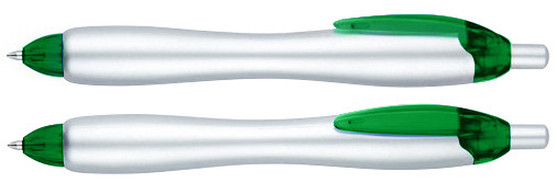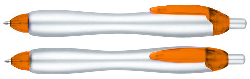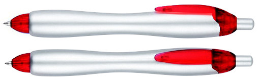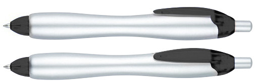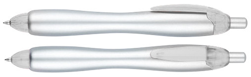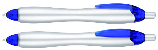 Bolígrafo “Gordito Silver” con cuerpo plateado opaco y terminales de color translúcido. Escritura azul.