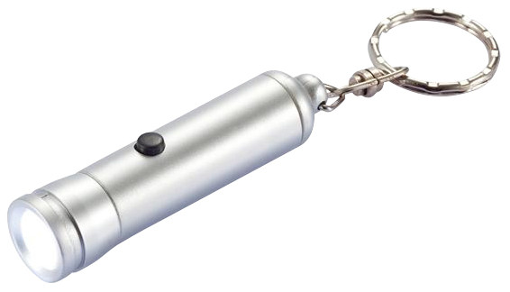 Llavero-Linterna LED plástica color plata. Usa 3 pilas botón (incluidas).
