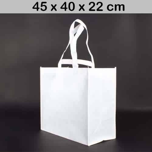 Bolsa reutilizable de tela PET no tejida de 90g/m2, modelo “Supermarket”. Con doble par de asas reforzadas, cortas (22cm c/u) y largas (66cm c/u). Ideal para Sublimación.