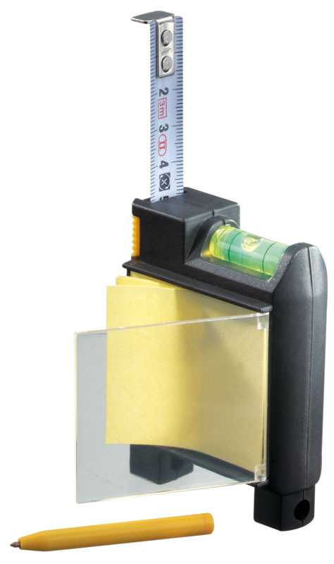 Huincha de medir (metálica-rígida) de 3 mts multifunción. Incluye lápiz pasta, post-it para apuntes, nivel y abrasadera para bolsillo o cinturón.