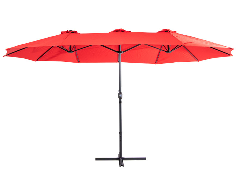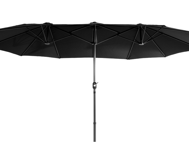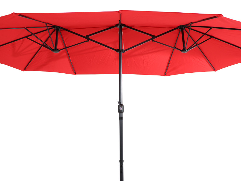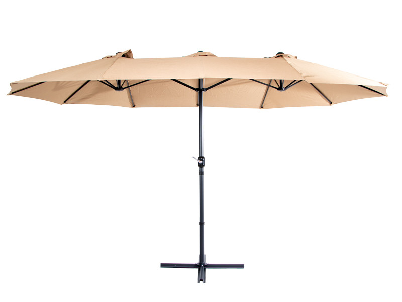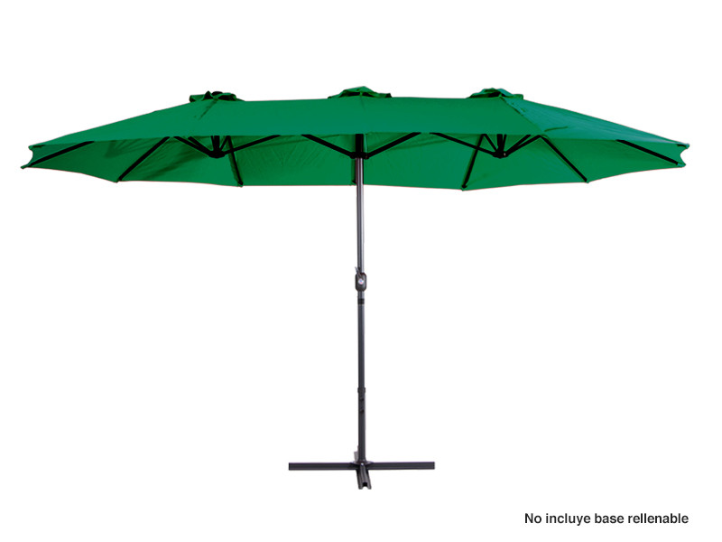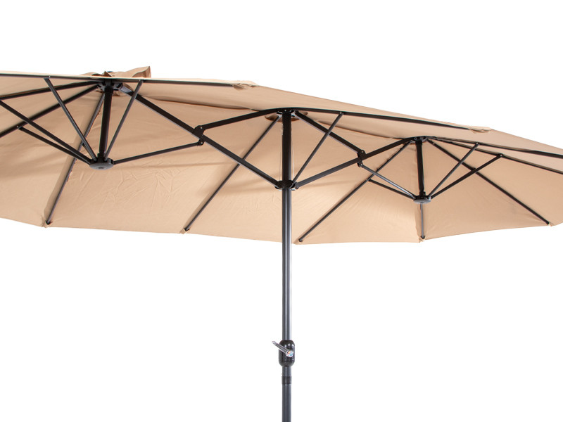 Quitasol ovalado doble de 4.55 x 2.7 m, modelo “Twins”, con 12 cascos de lona Poliéster UV impermeable de 180g. Contiene varas reforzadas de Acero recubierto de 12 x 18mm, asta de Acero recubierto de 48mm, sistema de apertura automático con manivela.