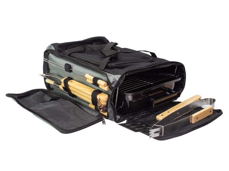 Bolso de Viaje 4-en-1. Incluye bolso, cooler, parrilla y 9 herramientas BBQ con mango de madera. Ideal para viajes, camping y picnic.