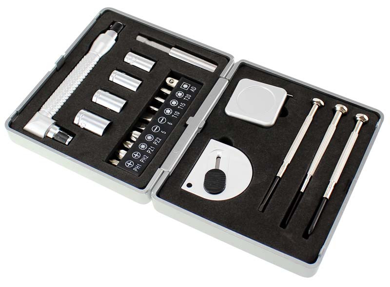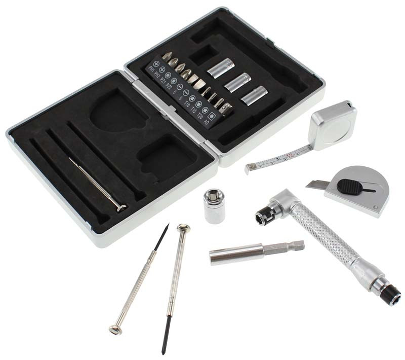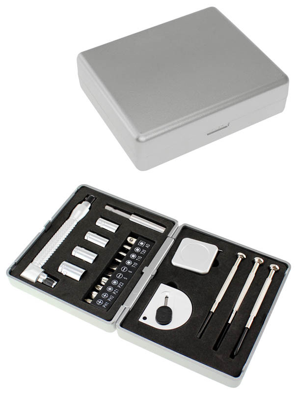 Set de 21 prácticas herramientas en caja rígida plástica plateada. Amplia área para impresión.
