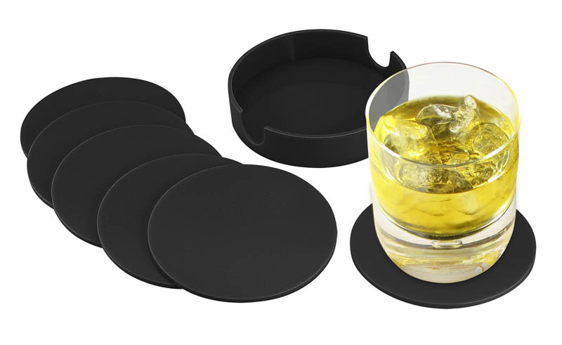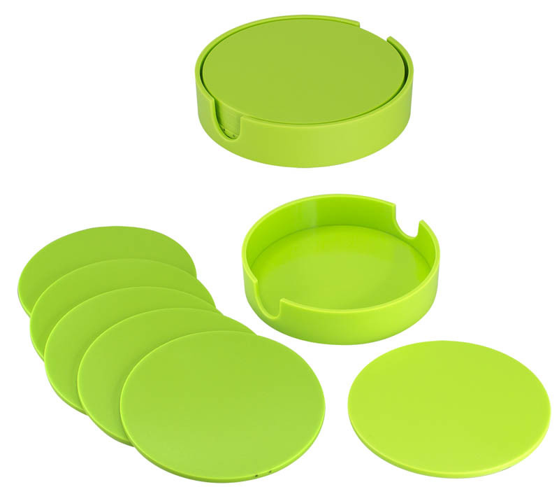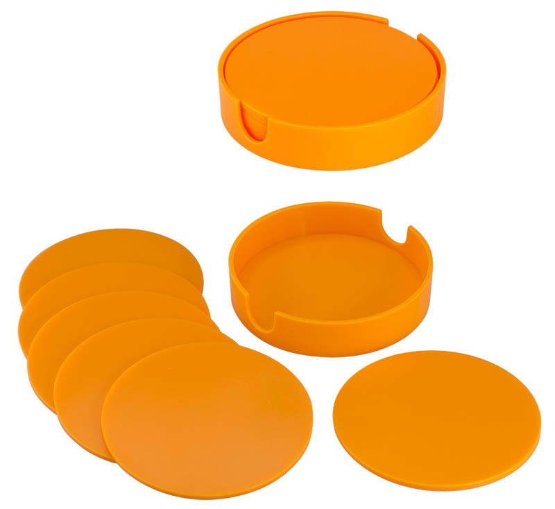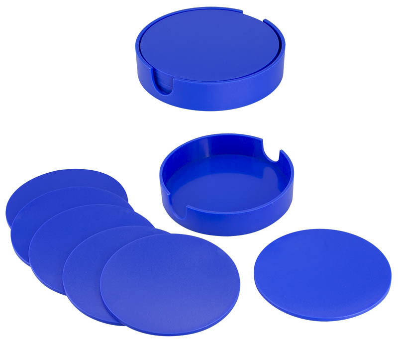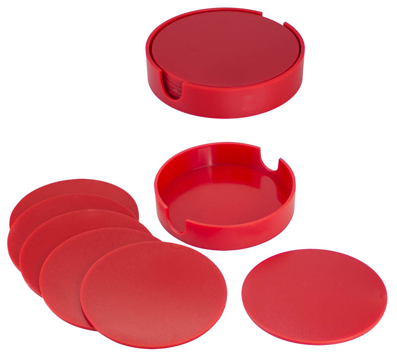 Set de 6 Posavasos Plásticos Redondos de 9.9 cm de diámetro, en plástico ABS de 3 mm de espesor. Contenidos en dispensador redondo del mismo material y color. Presentación en caja de cartulina blanca.