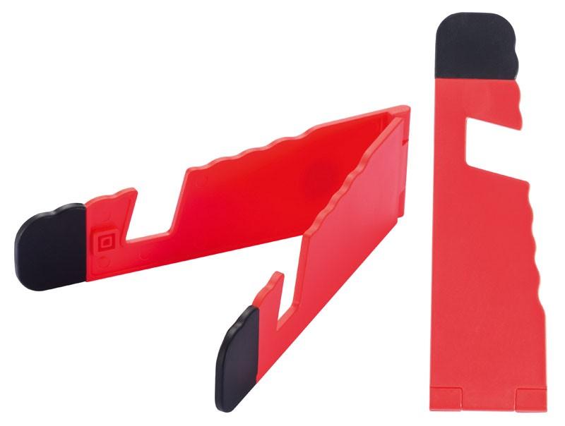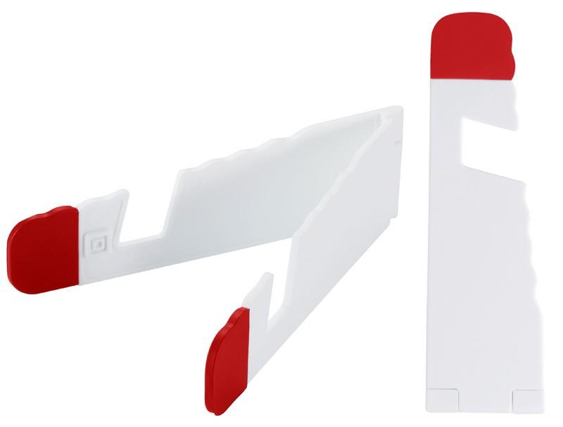 Soporte plástico abatible para iPad y Celular, con goma antideslizante en ambos terminales.